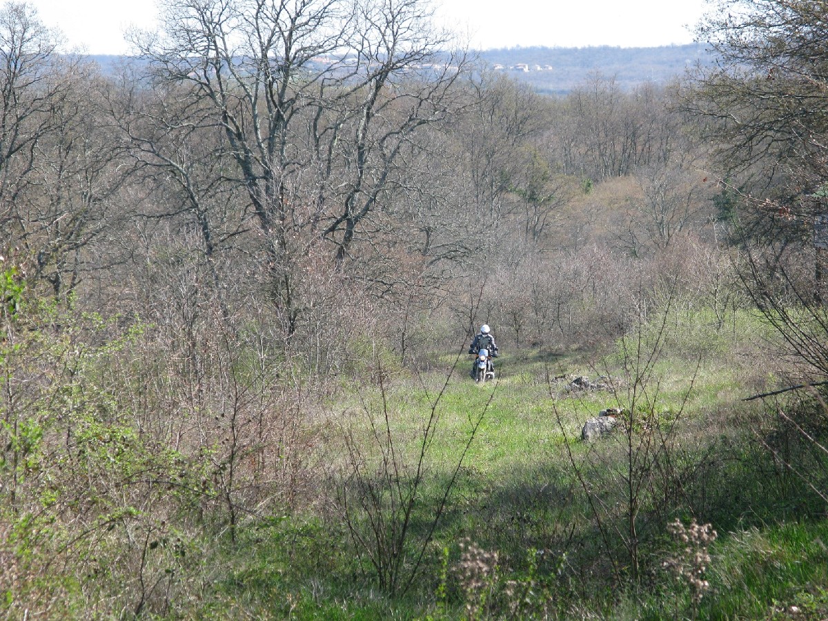 Nach dem Rückzug fahren wir weiter auf der D44 bis Buzet und trinken dort – eingelassen vom Dorfwächter unseren ersten Espresso des Tages im einzigen offenen Café des Ortes. Weiter geht’s kurvenreich bergauf Richtung Nordost und wir gelangen ab Racja Vas auf eine excellente Schotterstraße in Richtung Ucka-Massiv. Mittlerweile ist´s Frühnachmittag und auf der Jausenstation am Poklon-Pass stärken wir uns mit einer Gemüse- und einer Rindersuppe. Dann geht’s weiter Richtung Südost auf Schotter in Richtung Kremenjak. Zuerst alles paletti, dann aber Verfranse und statt bergab in Richtung Meer geht es immer weiter hinauf und tief tief ins Massiv hinein. Endlich nimmt uns eine Kehre/Wende/ Sackgasse die Entscheidung ab, ob wir richtig oder falsch sind: wir sind eindeutig falsch.