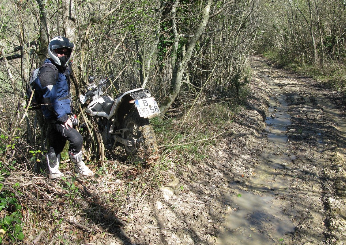 Einmal wird ein harmloser Feldweg just zum Pfützen-Steine-Fahrrillen.-Mosaik. Es wechseln sich die Passagen „Vollgas-im-niedrigen-Gang“ zum Tanz über die Steine mit „Spring-spring-von-Pfütze-durch-Pfütze“ ab mit „Trau´-ich-mich-oder muss-Martin-wieder-die-Maschine-durchfahren?“ Passagen ab.