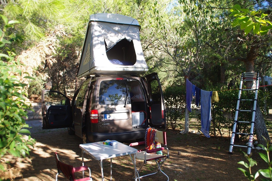Am späteren Nachmittag kommen wir am Zielort an: dem Campingplatz Apollon kurz vor Delphi. Leider hat das Platzrestaurant zu dieser Jahreszeit schon zu, aber beziehen einen sonnigen Terrassenplatz mit unserm Caddy und geben uns erst einmal der Abendsonne im Relaxstatus hin.