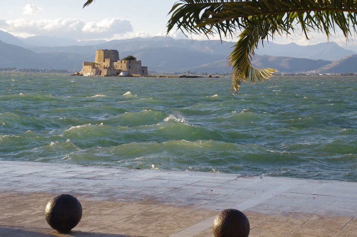 Auch die Palamidi-Burg hoch über der Stadt betrachten wir nur vom Auto aus durch die Regenwogen hindurch. Die 999 Stufen, die zur Burg von der Stadt hinauf führen, müssen wir ein ander´ Mal gehen.