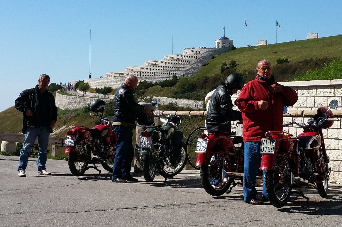 Oben angekommen, belohnt wieder der unglaubliche Blick in die Landschaft und auf die umliegenden Berge Venetiens. Lautes Knattern erfüllt auf einmal die Gipfelluft und ein Truppe von vier alten Moto Guzzis Falcone wird von ihren „Erstbesitzern“ – zumindest möglich, was deren Lebensalter betrifft – abgestellt und zur allgemeinen Bewunderung freigegeben.