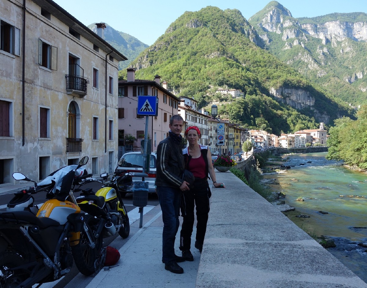 Weiter geht es dann hinauf auf das Altopiano dei sette communi, der Hochebene über der Brenta. Wieder wechseln sich lange C´s mit Haarnadeln ab und spucken uns bei Enego auf dem Marktplatz aus. Diesmal sehen wir die kleine Stadt im gleißenden Sonnenlicht und sie macht einen viel einladenderen Eindruck als sonst oft. Eingehüllt von Waldmeisterschwaden aus den Wäldern rechts und links geht´s dann hinunter über Foza bis nach Valstagna, einem uns bislang noch unbekannten Kleinod an der Brenta.