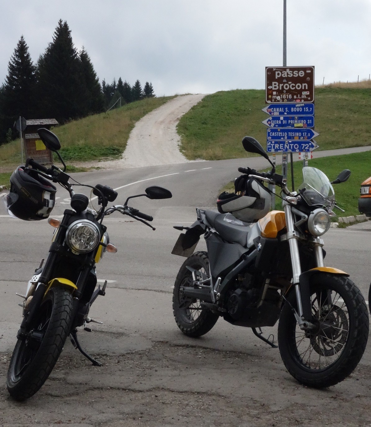 Die Auffahrt auf den Passo Brocon führt über eine tolle Straße: Kurven, Kehren, Galerien, dann später lang gezogene waldige Kurven. Oben angekommen sieht´s dort aus wie Spinnerbrücke in Kleinformat: jede Menge Motorradfahrer sitzen Cappuccino schlürfend vor der Passhütte. Sogar eine Berliner Truppe ist dabei. Wir gesellen uns hinzu und tun es den anderen gleich.