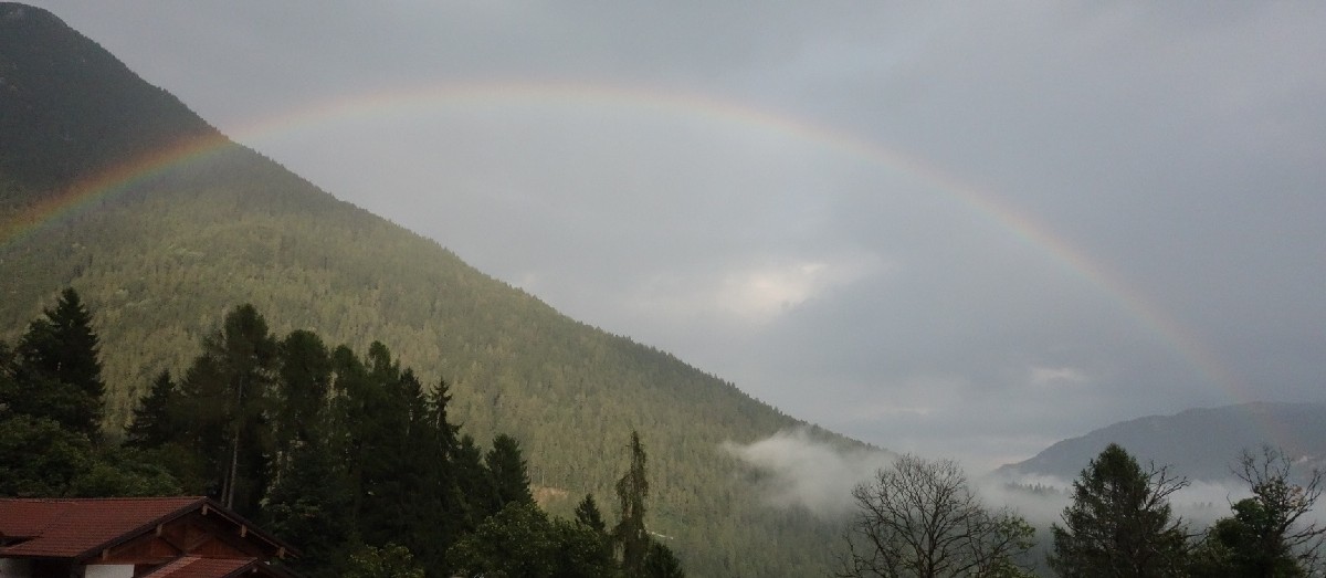 Auch abwärts geht es trocken über die spektakuläre Straße und zur Auffrischung der Konzentration nehmen wir noch einen Espresso in Telve. Weil wir so tapfer durchgehalten haben, belohnt uns der Wettergott mit einem fantastischen, das Tal umspannenden Regenbogen.