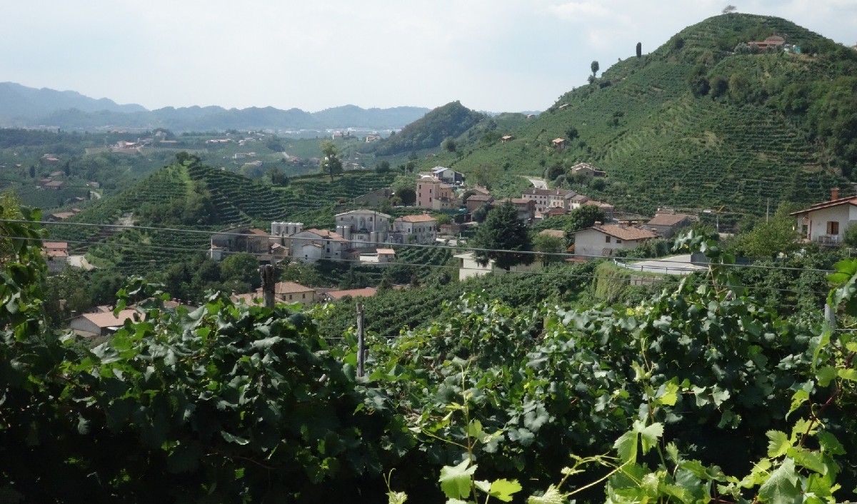 In Valdobiadene pausieren wir dann in einem Café auf dem Hauptplatz, nehmen den zweiten Cappuccino des Tages ein und ein exzellentes Panini mit Pomodoro, zerlaufenem Käse und Speck. Weiter geht´s über die Strada de Prosecco, immer entlang von Weinbergen, die voll der süßen weißen Trauben sind.