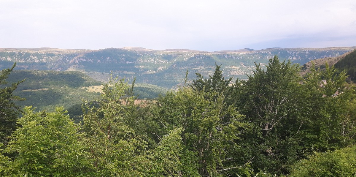 Die D51 bevölkern wir dann in Richtung Süden ziemlich alleine, den höchsten Berg der Cevennen, den Mont Lozere, rechts neben uns lassend bis zum Eingang der Tarnschlucht. In die biegen wir ein und ab und an stoppen wir um uns satt zu sehen an den weit unter uns bugsierenden Kanufahrern, deren Lachen bis zu uns hoch schallt. An diesem Sommersonnensonntag aalt sich Halbsüdfrankreich auf den Kieseln des braunen Tarn. Wie bunte Flecken wirken die Badegäste im graugrünen Dschungel des Flussbetts.